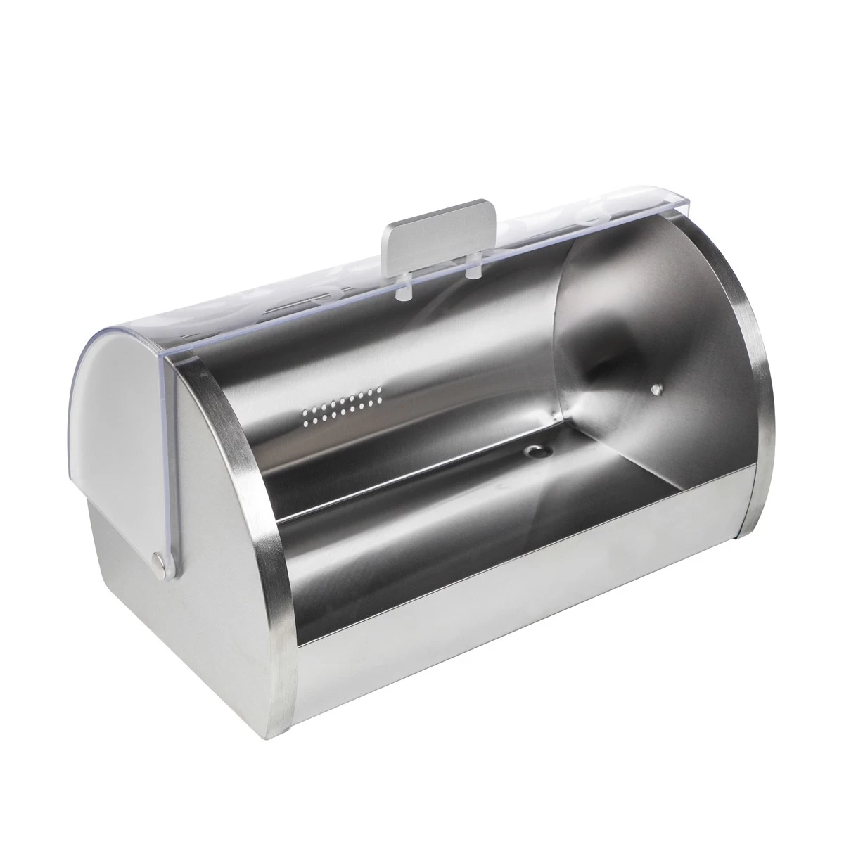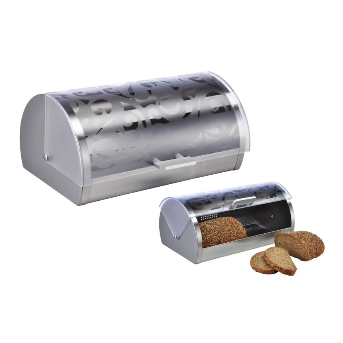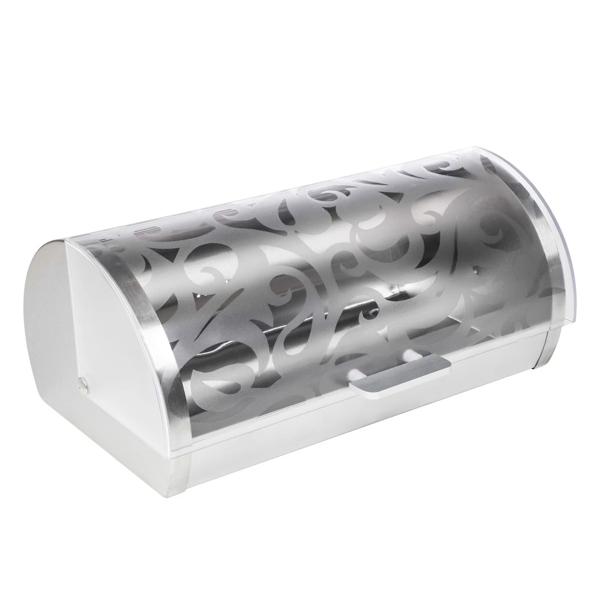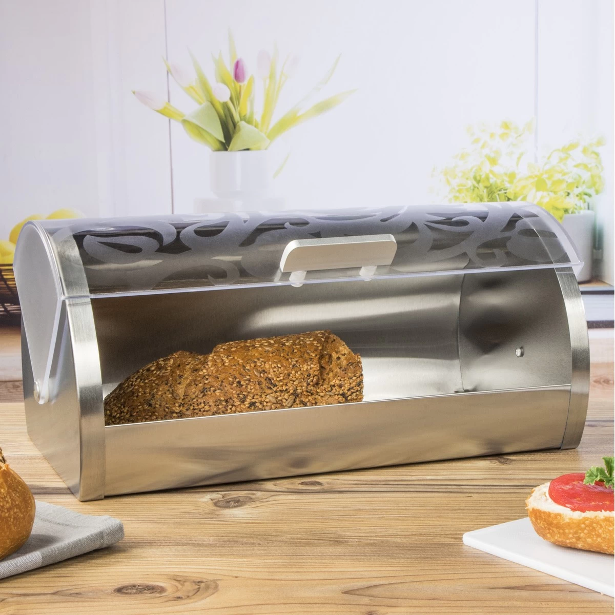 Diese Brotkiste hält Deine Brötchen und Dein Brot deutlich länger frisch. Sie ist mit einem transparenten Acryldeckel mit silbernem Blumenmotiv ausgestattet, der leicht nach hinten drehbar ist.