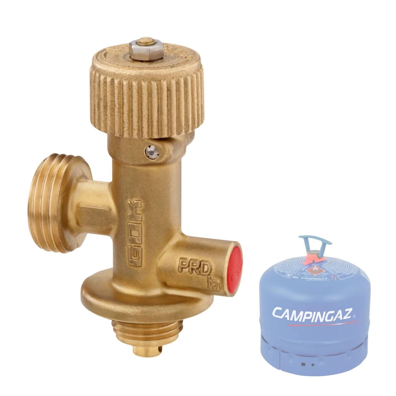 Eingebaut ist bereits ein Sicherheitsventil, das bei sehr hohem Druck auslöst (30 bar). Zu sehen ist das Ventil an der roten Kappe an der Seite. Rot steht für PROPANGAS (30bar) und blau steht für BUTANGAS (14 bar)