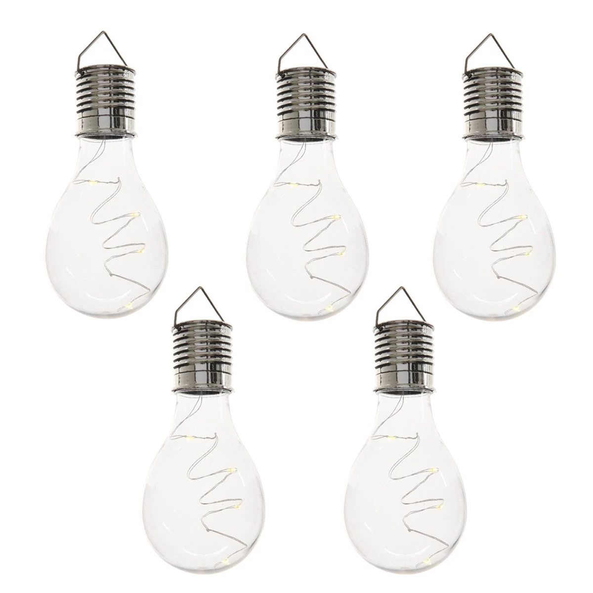 Die 5 transparenten LED Solar Glühbirnen sind die ideale Dekoration zum Aufhängen. Die warmweißen LED an der Drahtlichterkette im Inneren der Glühbirnen verbreiten ein schönes Licht in Deinem Garten, auf Deiner Terrasse oder Deinem Balkon.