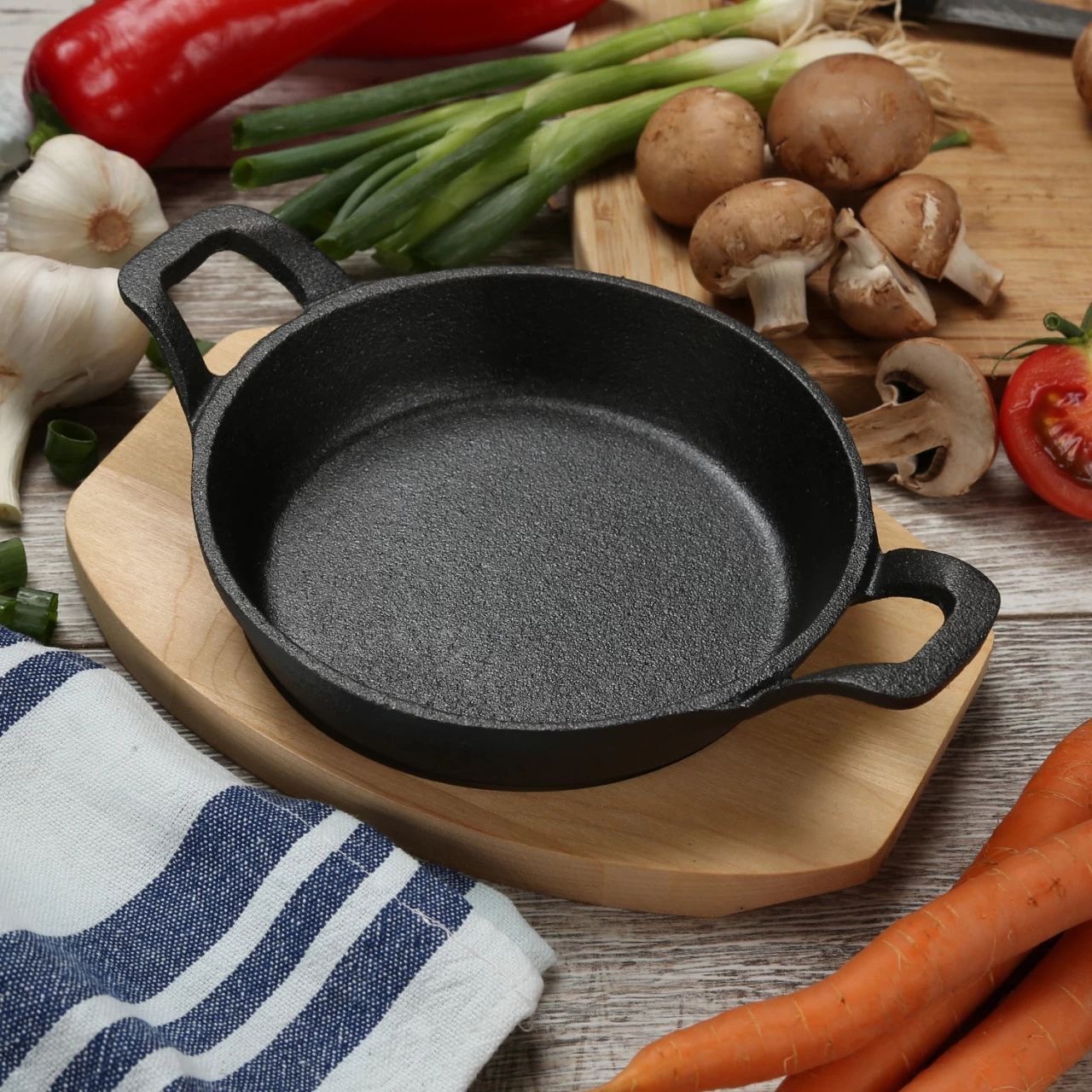 Minipfanne mit 2 Griffen u. Holzuntersetzer – Gusspfanne – Gusseisen – D: 15cm – Servierpfanne