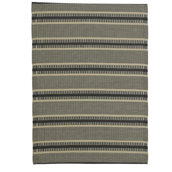 Das Material aus 100% Polypropylen überzeugt durch seine Langlebigkeit und seine Formbeständigkeit. Der schwarz-beige gestreifte Teppich ist wasser- und schmutzabweisend. So kannst Du den Teppich jederzeit abfegen oder mit dem Gartenschlauch abspritzen. Der hohe UV Schutz schützt den Outdoor Teppich vor den Sonnenstrahlen.