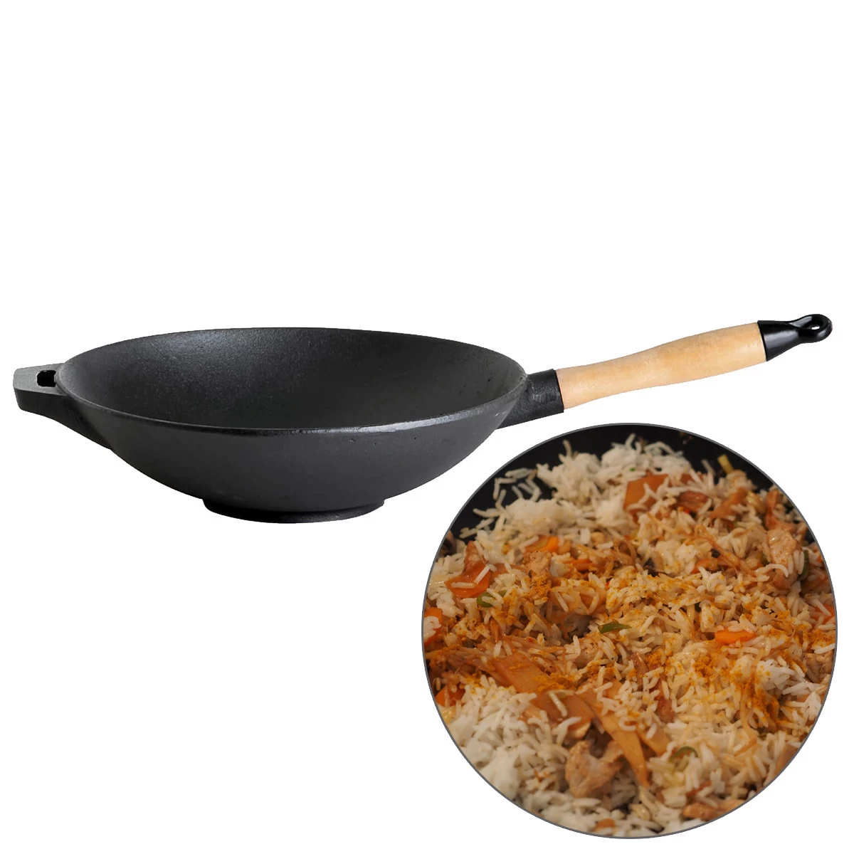 Wok aus Gusseisen – Wokpfanne mit Holzgriff – D: 30cm