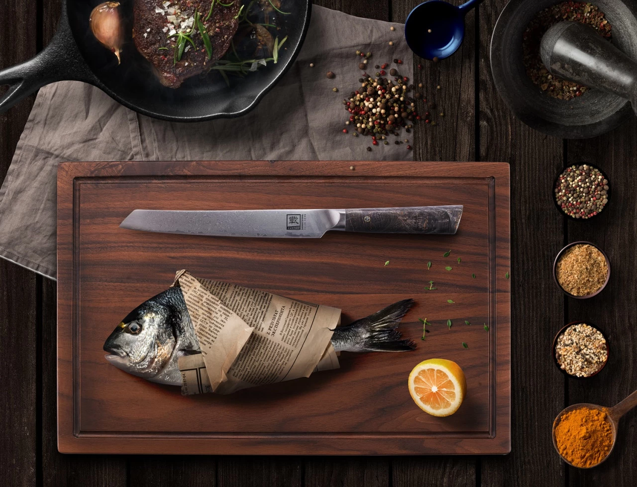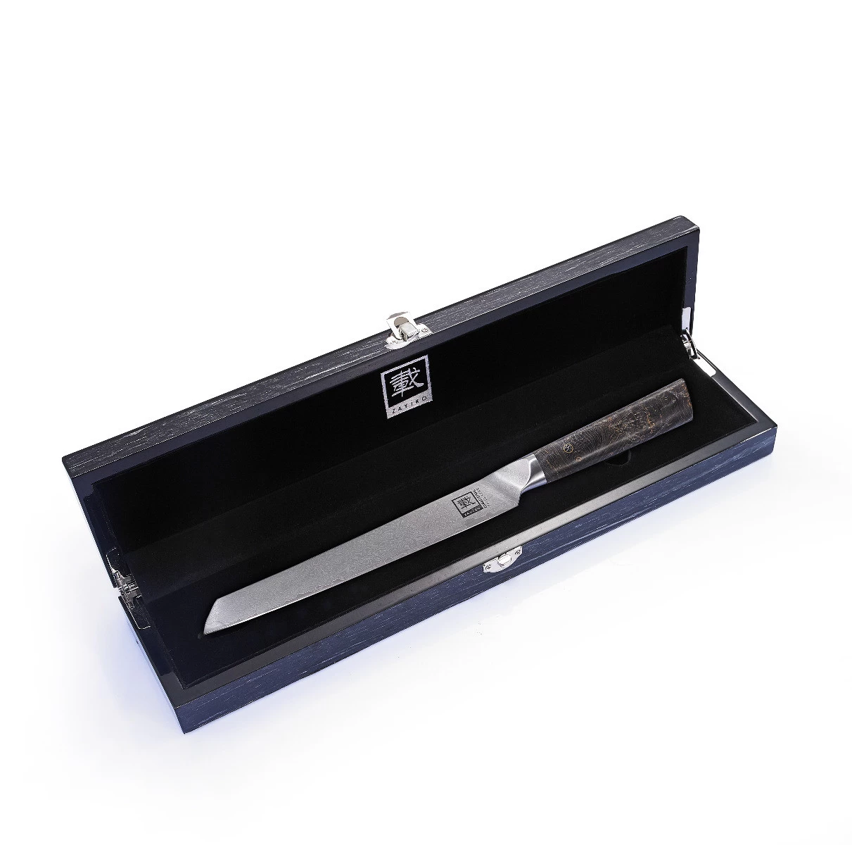 Die Serie DAITO PROFI LINE ist ein Kochmesser mit Griff aus dunklem Ahornholz und 67-lagigem, japanischem Stahl