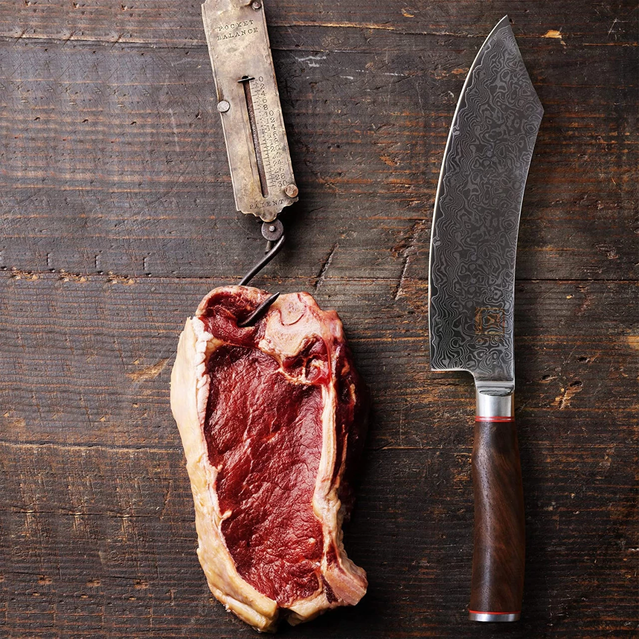 - Bitte schneide keine harten Materialien wie Knochen, oder gefrorene Lebensmittel. Damaststahl ist härter als Walzstahl und somit auch bruchempfindlicher